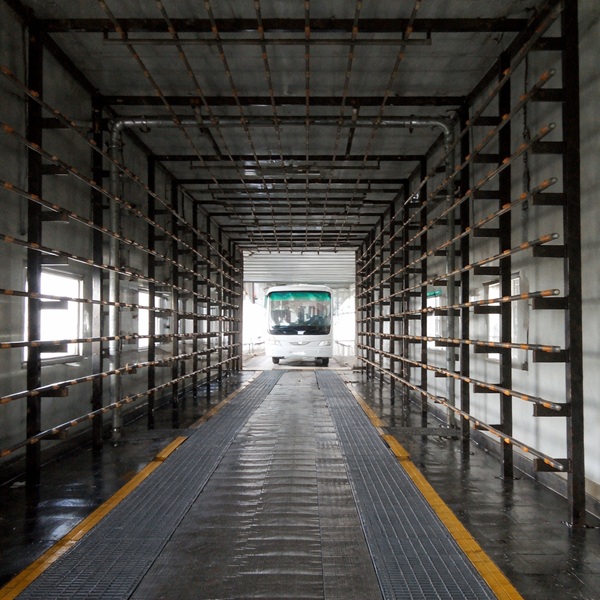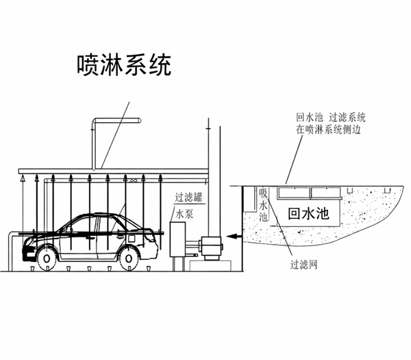 4.5.1、噴淋系統(tǒng)主體結(jié)構(gòu)分為前、后兩段。主體結(jié)構(gòu)和水管等均采用不銹鋼材料。可以保障各類車輛在其間自行駛通過;