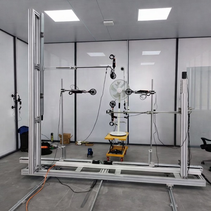 3、風速表的葉片平面與被試電風扇的扇葉平行,距離為被試電風扇扇葉直徑的三倍;增加測試裝置定位機構,可以自動定位。