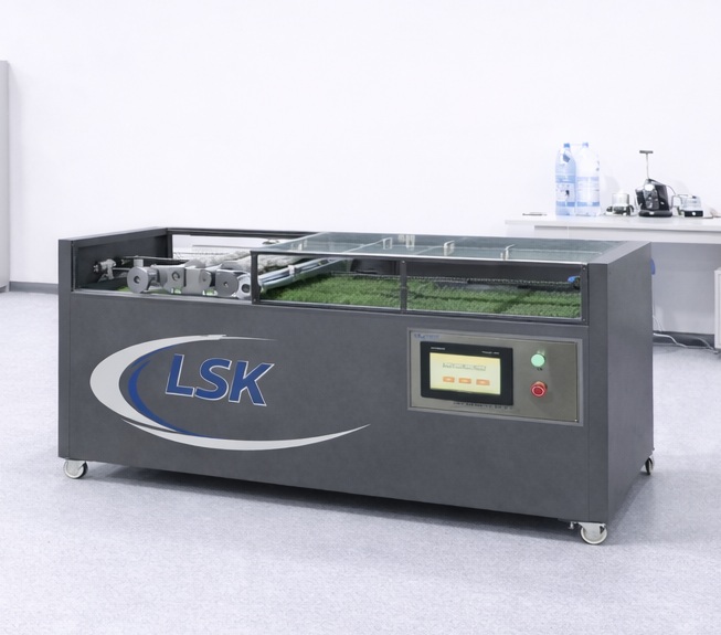 人造草坪耐磨損試驗(yàn)機(jī)通過LSK-YD05測(cè)試設(shè)備上的釘輥在人造草坪樣品上來回碾壓,模擬正常使用時(shí),運(yùn)動(dòng)員穿著帶釘運(yùn)動(dòng)鞋在草坪上運(yùn)動(dòng),達(dá)到一定的時(shí)間周期后,檢驗(yàn)、評(píng)價(jià)草坪的磨損情況。
