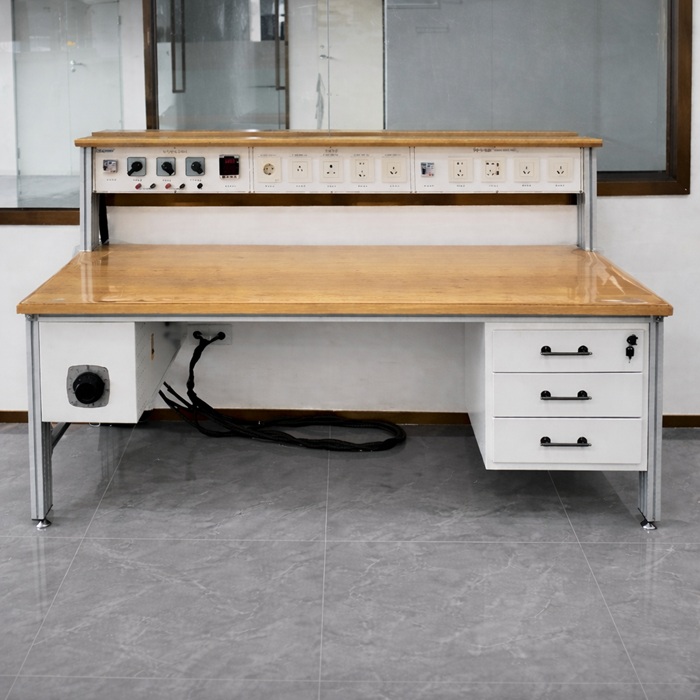 1、 整體采用鐵木結構制作,牢固、穩定;臺面為 30mm 厚純櫸木,漆面:黑色(定 制);具有耐磨及溫濕度變化環境中不易變形等特點;頂部為輸出電源插座、儀表 電源插座、參數顯示及控制操作開關等。